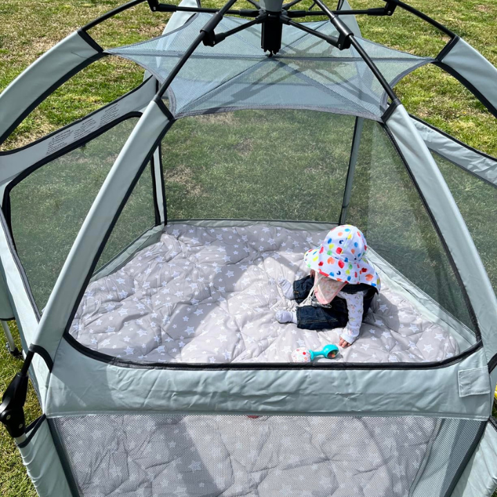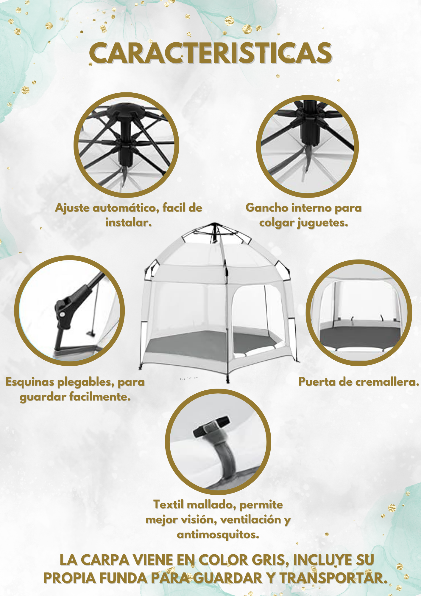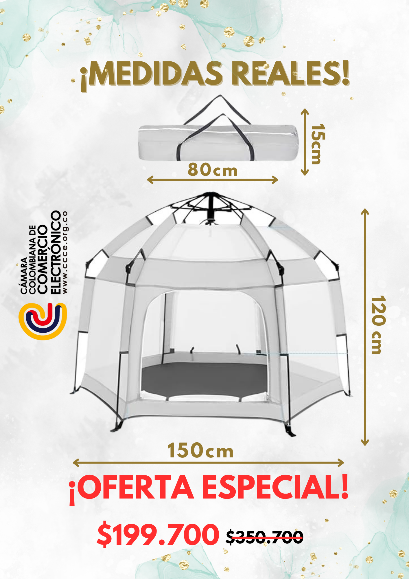 La carpa tiene una medida de 150 cm en todas sus direcciones y 120 cm de alto.