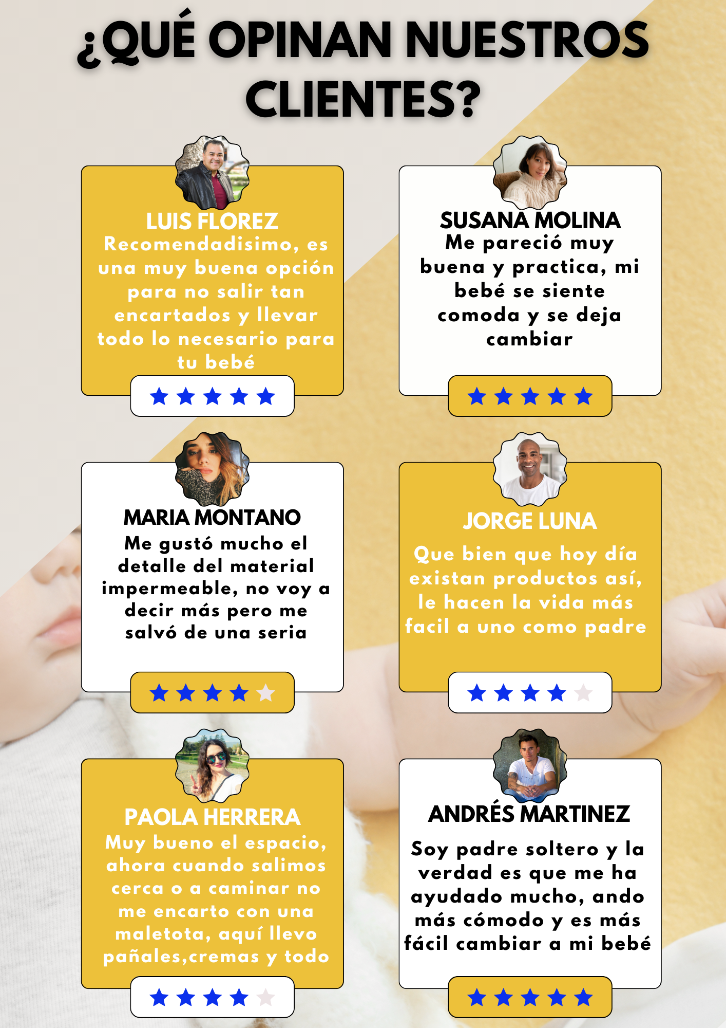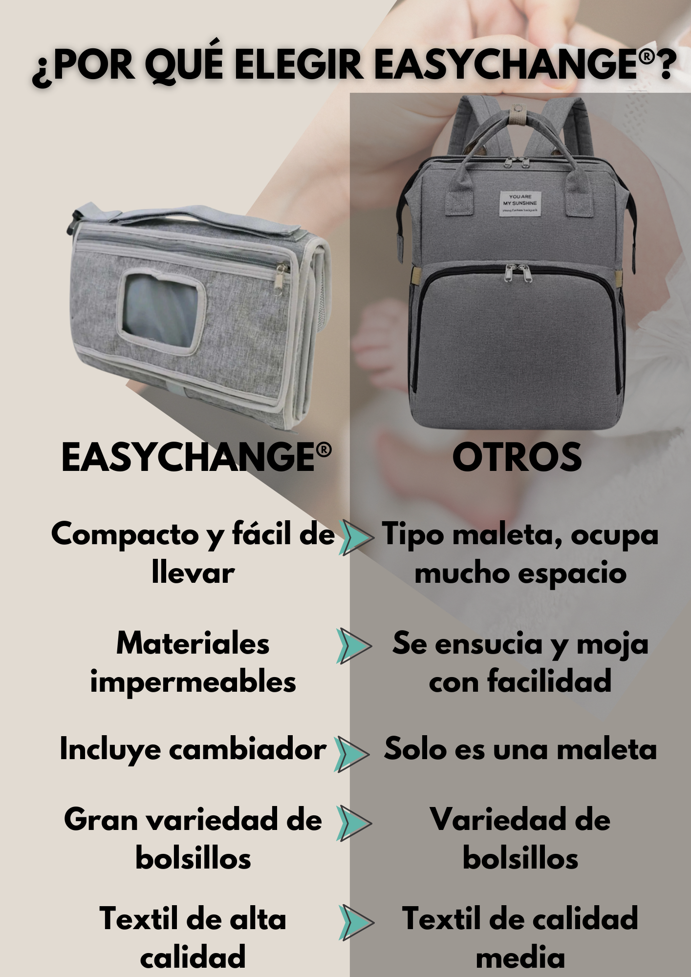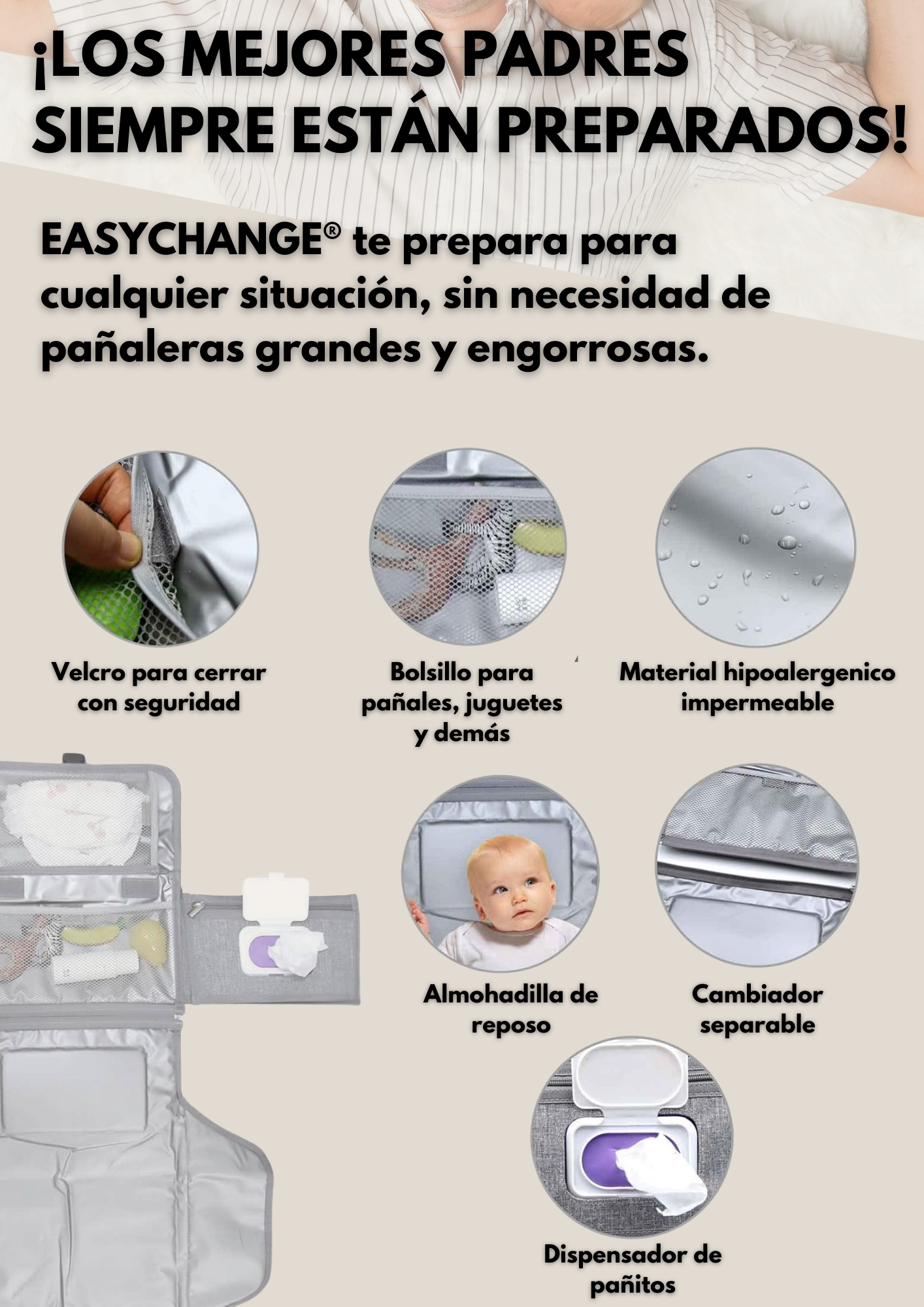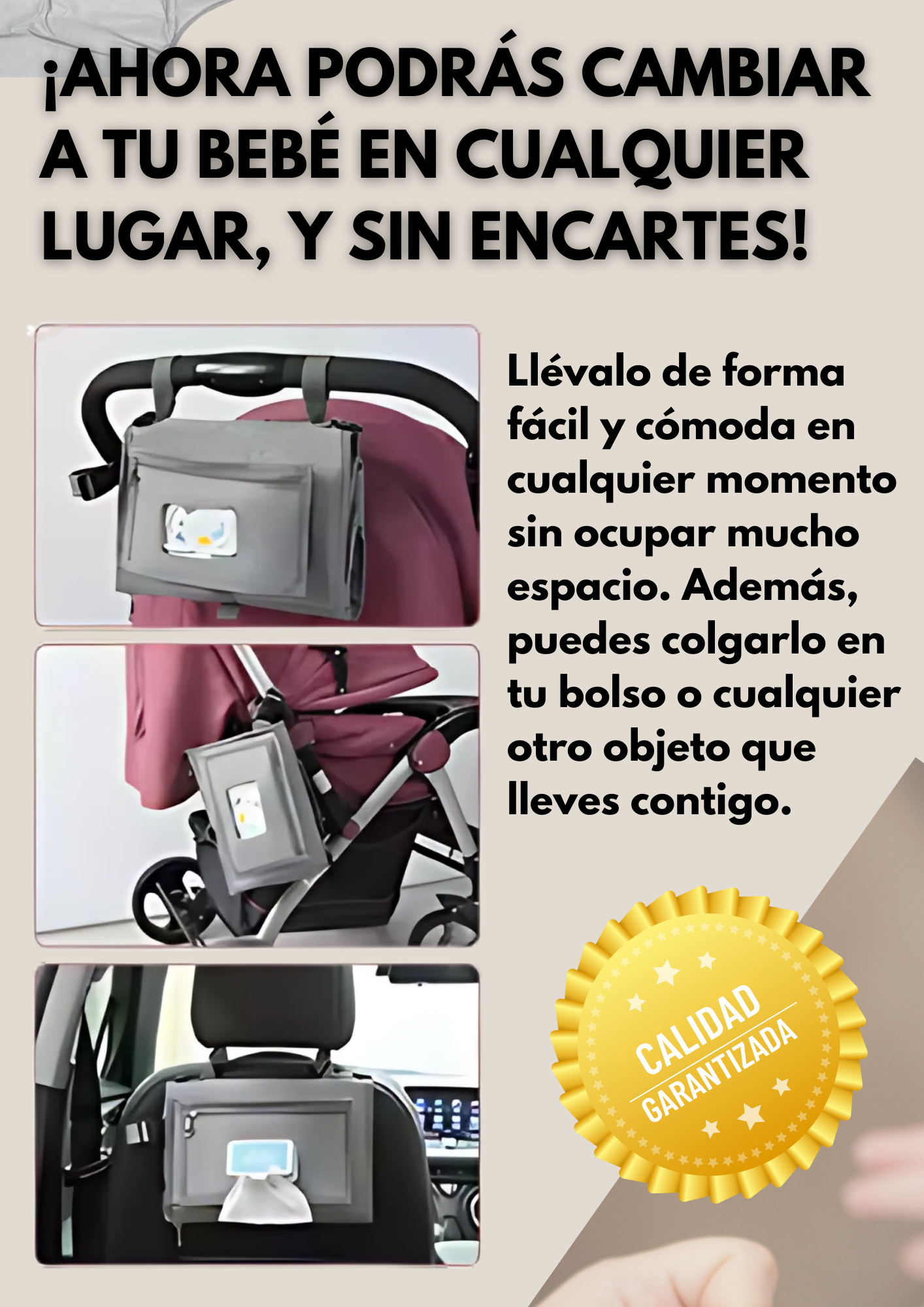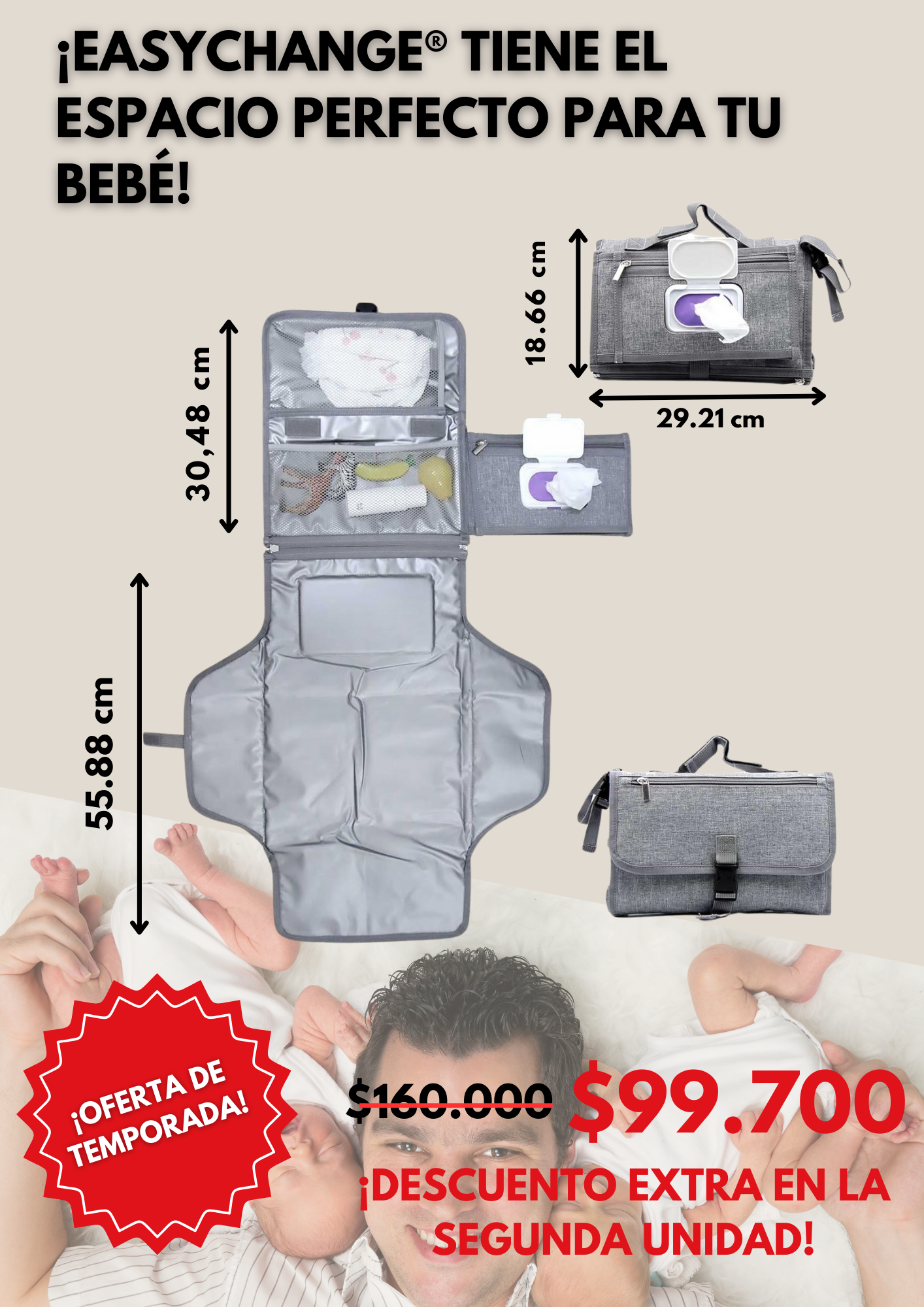 Tiene capacidad para aproximadamente 4 pañales, crema para bebés, toallitas húmedas y otros artículos esenciales en sus múltiples bolsillos.